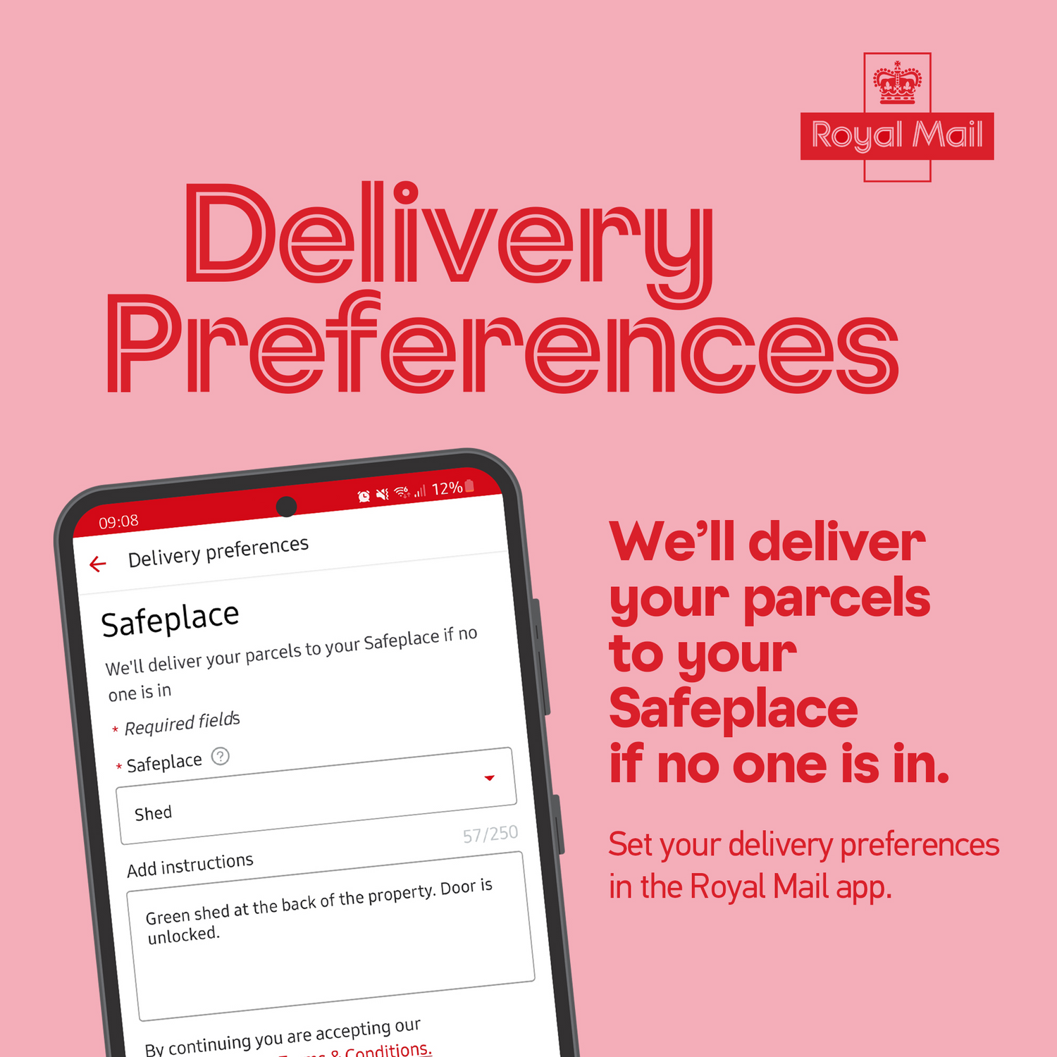If you've chosen Royal Mail as your preferred courier, please download their app to manage your deliveries. The app allows you to track your parcel, set delivery preferences (including a Safeplace for your items when you're not home), and book a redelivery.
