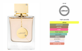 The fragrance opens with a vibrant burst of citrus and fruit, blending orange, peach, lemon, and a touch of cardamom for brightness and warmth. At its heart, a lush bouquet of rose, jasmine, geranium, and exotic lychee unfolds, delivering a rich and floral embrace. The base leaves a lasting impression with smooth vanilla, earthy vetiver, soft musk, and patchouli-creating a beautifully rounded and feminine dry down.