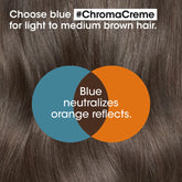With Chroma Crème shampoo, colour correct and care like a pro. To help correct unwanted warmth, choose the right colour correction. As blue neutralizes orange reflects, choose blue Chroma Crème for light to medium brown hair.