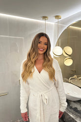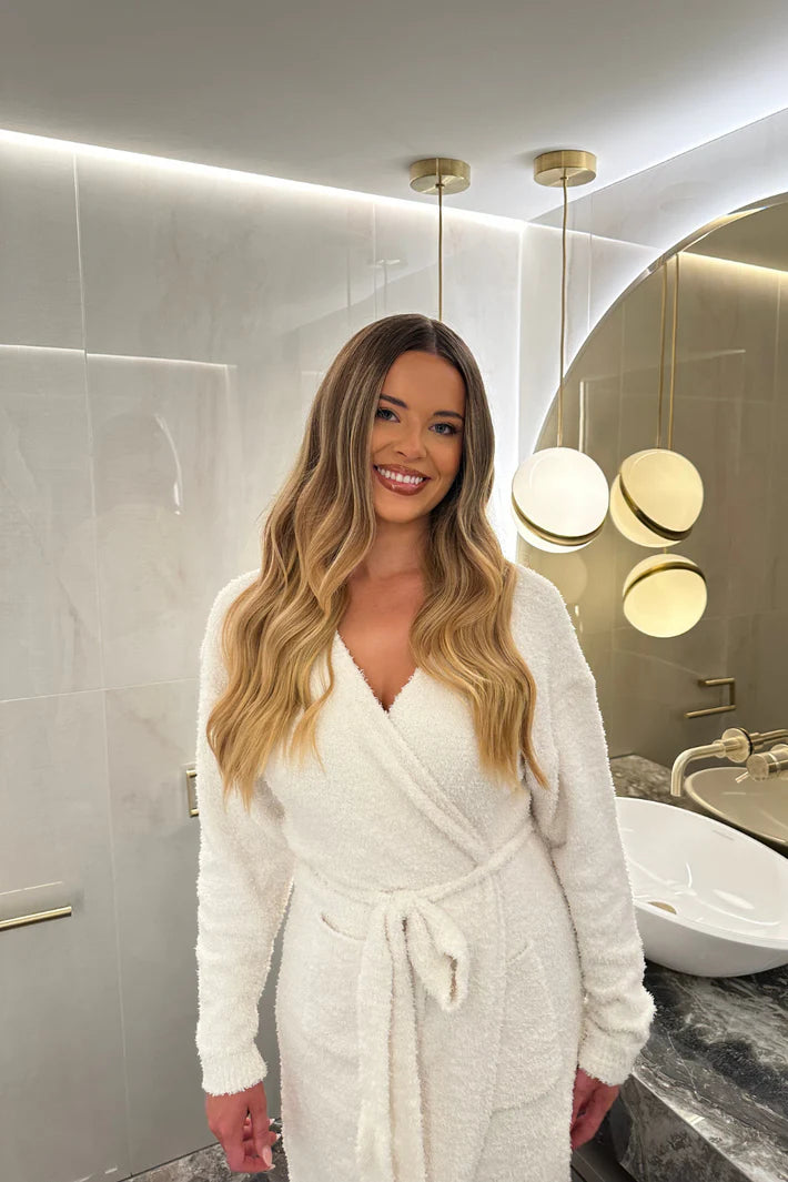 Styling: Use our Overnight Blowdry Heatless Curls to ensure a salon-worthy blow dry before applying the Halo. Alternatively, for the 18” 1 Piece Brushed Out Waves Hidden Halo, use a waving wand to create the desired affect before application.